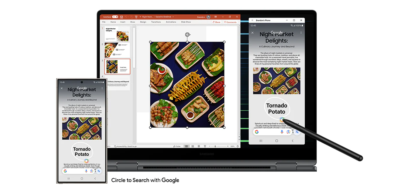 갤럭시 북5 프로 360은 360도 회전 가능한 2-in-1 형태로 태블릿처럼 사용할 수 있으며, 터치 스크린과 S펜을 지원해 필기나 드로잉 작업에 최적화되어 있습니다. S펜은 4096단계의 필압을 감지하고 낮은 지연시간으로 자연스러운 필기감을 제공합니다. 또한, 삼성 스마트폰과의 연동을 통해 '노트 어시스트', '실시간 통역' 등의 AI 기능을 쉽게 활용할 수 있어 생산성과 편의성을 높여줍니다.