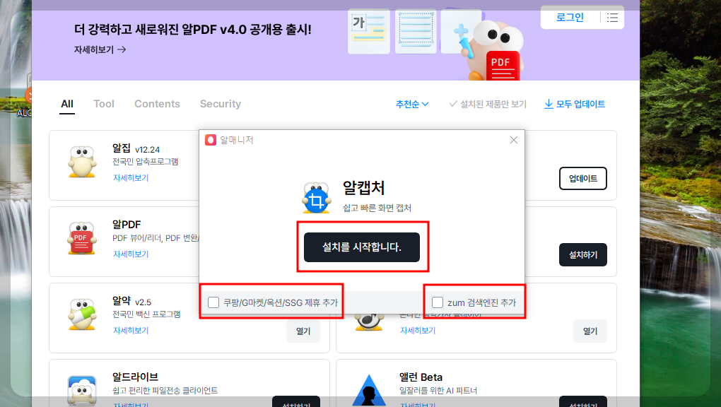 5) 설치를 시작하기 전에 <쿠팡/G마켓/옥션/SSG 제휴 추가>와 <zum 검색엔진 추가>의 체크박스를 해제합니다. 체크가 된 상태로 설치를 하는 경우 원치 않는 아이콘이 바탕화면에 생성됩니다. 원하신다면 체크하셔도 상관은 없습니다. <설치를 시작합니다.> 버튼을 클릭하면 설치가 시작됩니다.