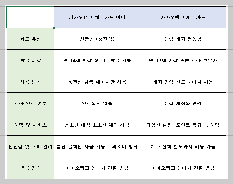 결론적으로, 카카오뱅크 체크카드 미니는 청소년이나 금융 경험이 적은 사용자에게 적합하며, 기존 체크카드는 성인이나 더 다양한 혜택을 원하는 사람들에게 알맞습니다.