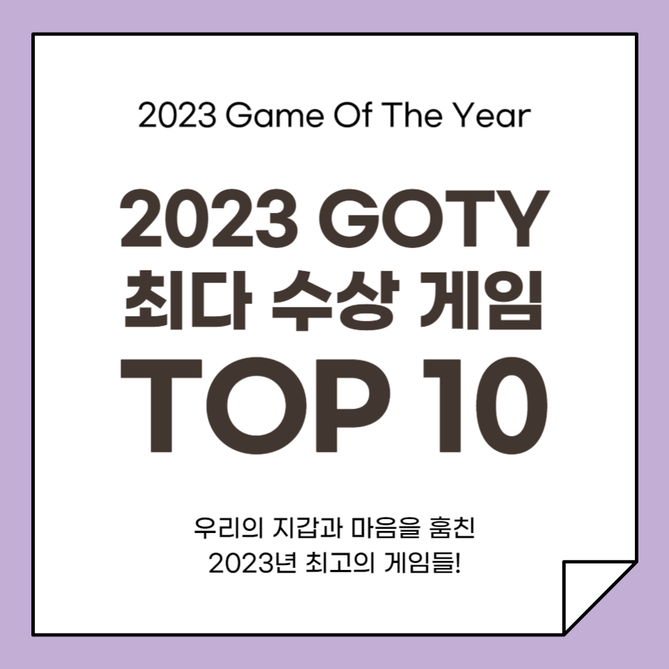이렇게 2023년을 빛낸 게임들을 살펴보았습니다. GOTY 수상작들은 대체적으로 많은 사람들에게 재미있다는 평가를 들은 게임이 많습니다. 그럼에도 사람들의 취향은 다를 수 있지요. 여러분의 고티는 어떤 게임인가요?